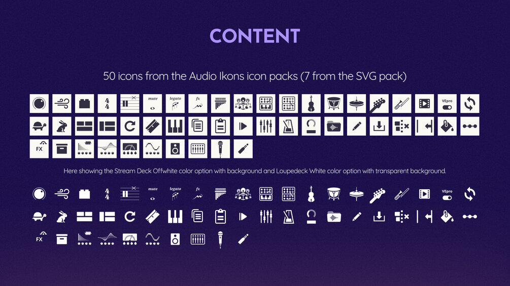 50 free icons for use with the Stream Deck, Loupedeck, Reaper, Fender Studio Pro (aka. Studio One). There are also a few icons from the Vector pack.