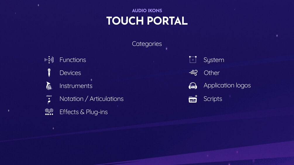 Audio Ikons - Touch Portal is a set of over 1700 icons optimized for use with Touch Portal. Perfect for composers, producers, sound designers and generally anyone who works with audio.